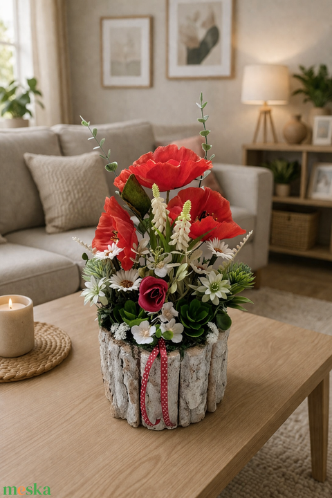 Pipacsos asztaldísz fakéreg kaspóban