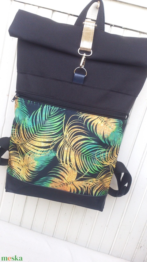 Kék, aranybarna-zöld hátizsák, vízálló- valódi bőrrel -laptoptáska- rolltop- ajándék -