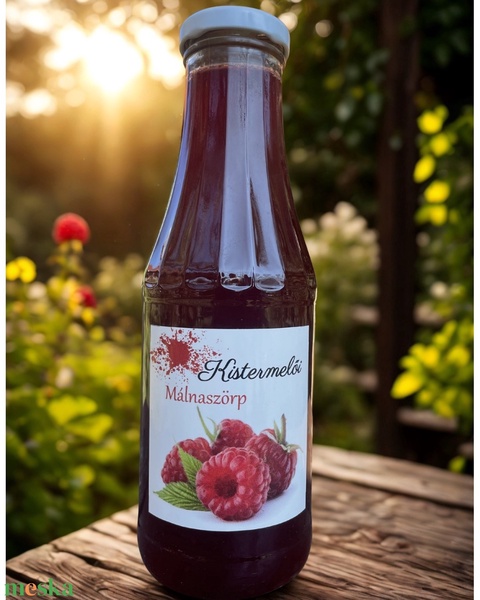 Magas gyümölcstartalmú, rostos, kézzel készített, saját termesztésű málnából valódi cukorral készült málnaszörp.