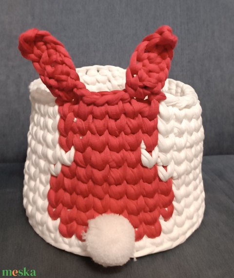 Fehér nyuszi bordó horgolt kosár Húsvétra