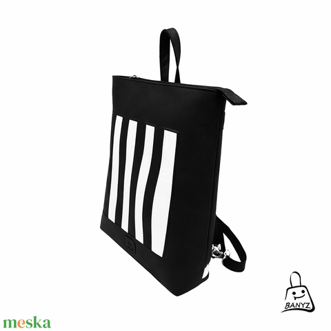 Ez a fekete–fehér A4-es méretű többfunkciós táska egyetlen darabban egyesíti a hátitáskát, a válltáskát és a kézitáskát.
