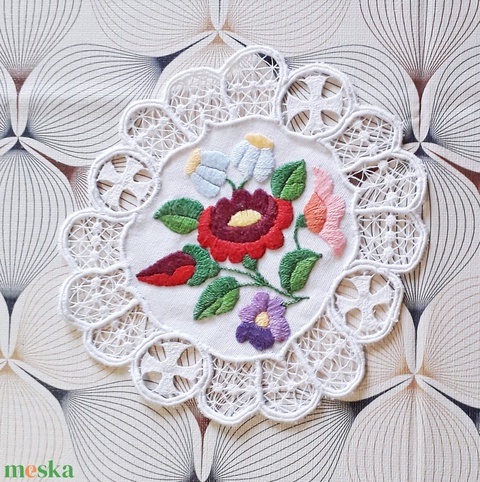 Kézi hímzett riselt kis díszterítő, átmérője 16 cm