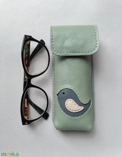 Mentazöld kék madár mintás bőr tolltartó, szemüvegtok