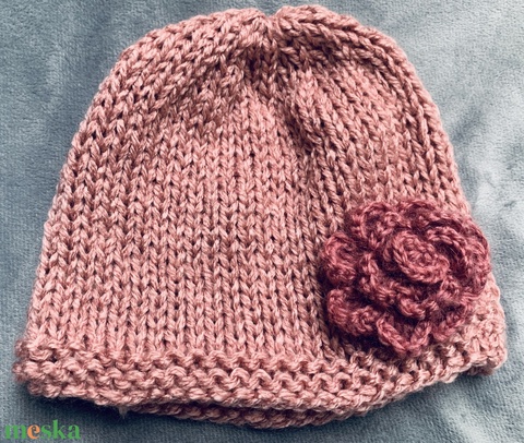 Gyerek sapka . Kézi kötésű púder színű sapka horgolt hímzett piros virágokkal díszítve eladó.