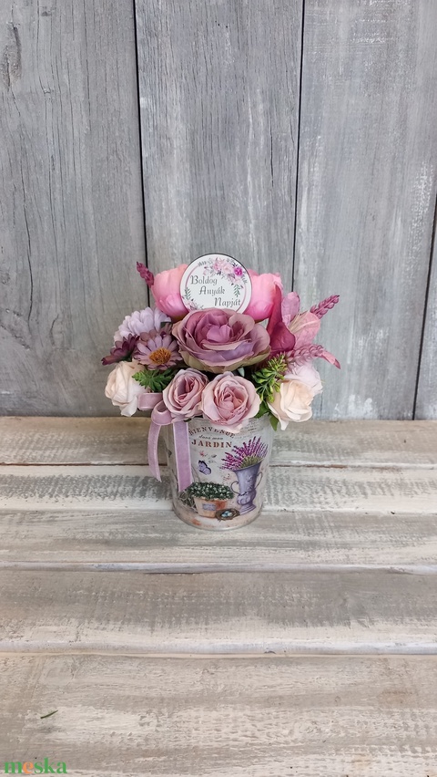 - Anyag/Összetevő művirágok, tűzőhab, bádogkaspó, táblácska, bársonyszalag