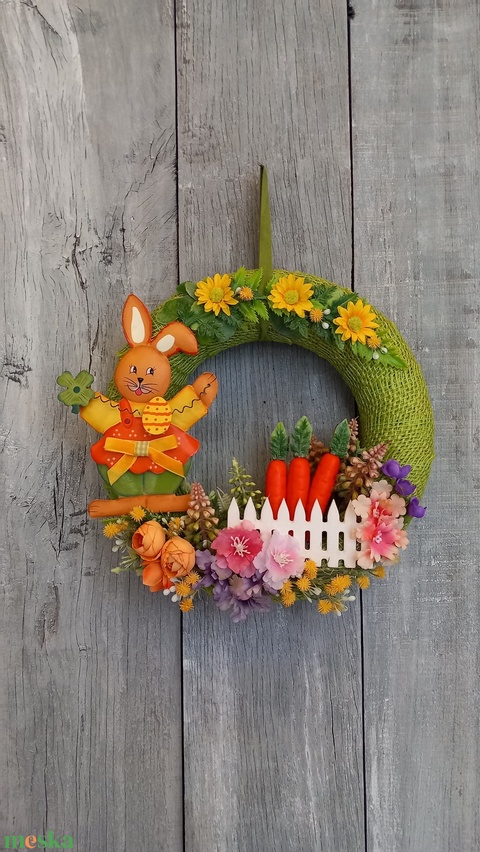 - Anyag/Összetevő művirágok, műzöldek, szalag, nyuszidekor, selyemvirágok, szalmakoszorúalap