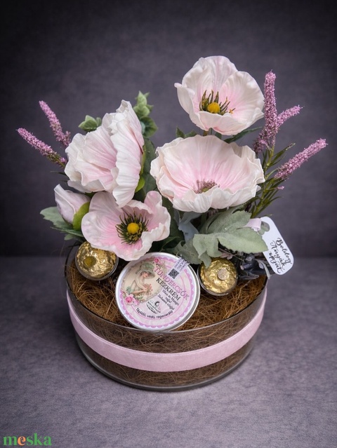 - Anyag/Összetevő zöldlevelek, dekortábla, üvegtál, pipacs, tulipán, levendula