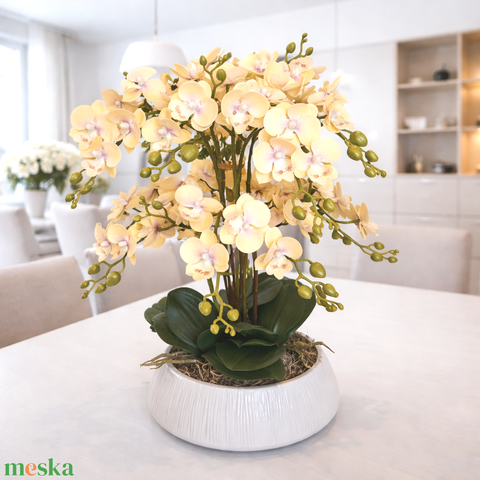 Sok virágos orchidea dekoráció kerámia tálban