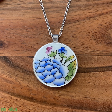 Mentett porcelán darabok - virágos nagy medálos nyaklánc - nemesacél