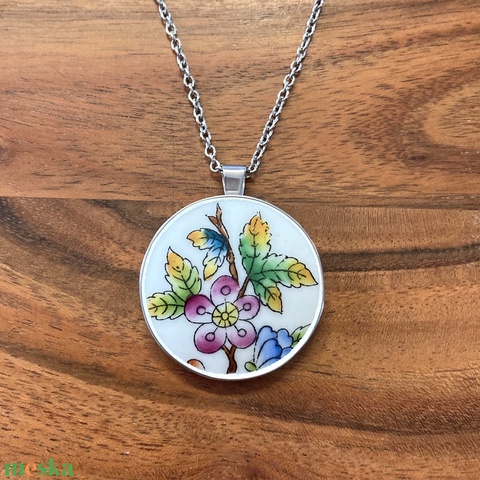Mentett porcelán darabok - virágos nagy medálos nyaklánc - nemesacél