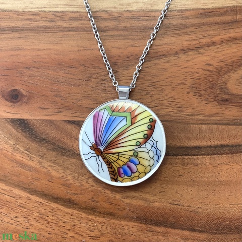 Mentett porcelán darabok - pillangós nagy medálos nyaklánc - nemesacél