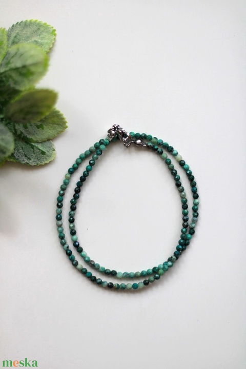A krizokolla nyaklánc nem csupán gyönyörű, de mélyen nyugtató és gyógyító energiáival is támogatja viselőjét a mindennapokban, hiszen ez az ásvány a kommunikáció, a belső béke és az érzelmi harmónia köveként ismert a kristálygyógyászatban.