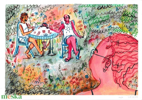 Nyár című printem egy egyedi, manuálisan, színes ceruzával rajzolt kép, ami egy kedves, meleg, nyári estét mutat be. A vacsora utáni kártyázás, és iszogatás hangulata a kertben.