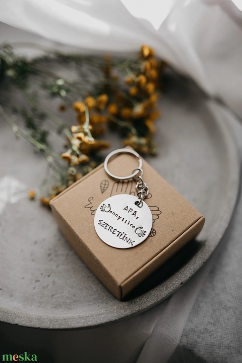 A kulcstartót lánccal és kulcskarikával együtt küldjük. Minden darabot ízléses ajándékdobozban csomagolunk, így azonnal ajándékozható.