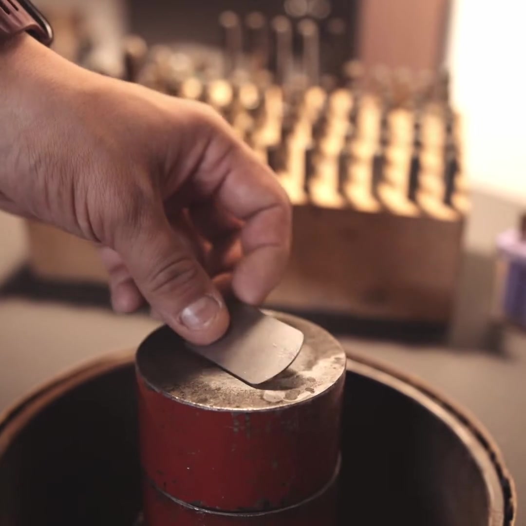 A szöveg egy 34 mm átmérőjű, kerek medálra kerül. Minden egyes betűt, jelet és szimbólumot külön, kézzel ütünk be a fém felületébe, ezért minden darab egyedi. Műhelyünkben kézi szövegbeütéssel dolgozunk, nem gravírozással és nem gépi eljárással.