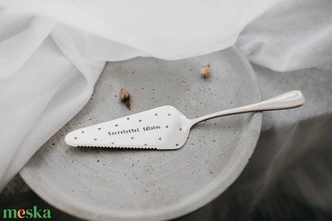 Ez a tortalapát rozsdamentes acélból készült, és három színváltozatban rendelhető: ezüst, arany és réz. A lapát tálaló részén a „Szeretettel tálalva” felirat látható, a felületén pedig elszórtan kis szívek.