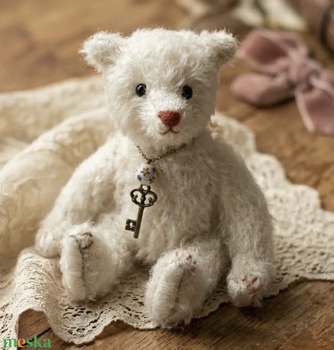 Fehér mohairből készült, hagyományos szalma töltéssel, amely az igazi vintage mackók hangulatát idézi. Minden végtagja mozgatható, fekete üveg szemei vannak és kézzel hímzett orra. Talpait puha gyapjú filc borítja, ami tovább erősíti antik karakterét. Antik stílusú kulcs medált visel, amely teljessé teszi egyedi személyiségét. 🐻🤍✨