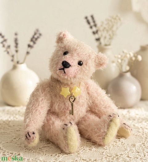 Halvány rózsaszín mohairből készült, hagyományos szalma töltéssel, amely az igazi vintage mackók hangulatát idézi. Minden végtagja mozgatható, fekete üveg szemei vannak és kézzel hímzett orra. Talpait puha gyapjú filc borítja, ami tovább erősíti antik karakterét. Antik stílusú kulcs medált visel, amely teljessé teszi egyedi személyiségét. 🐻🤍✨