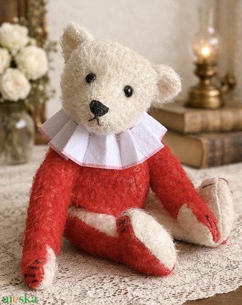 Piros/fehér mohairből készült, hagyományos szalma töltéssel, amely az igazi vintage mackók hangulatát idézi. Minden végtagja mozgatható, fekete üveg szemei vannak és kézzel hímzett orra. Talpait puha gyapjú filc borítja ami antikolva is lett a régi mackók stílusát idézve. Antik stílusú gallért visel amely teljessé teszi egyedi személyiségét. 🐻🤍✨