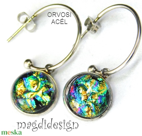 Szivárványos színjáték üvegékszer stiftes lógós fülbevaló
