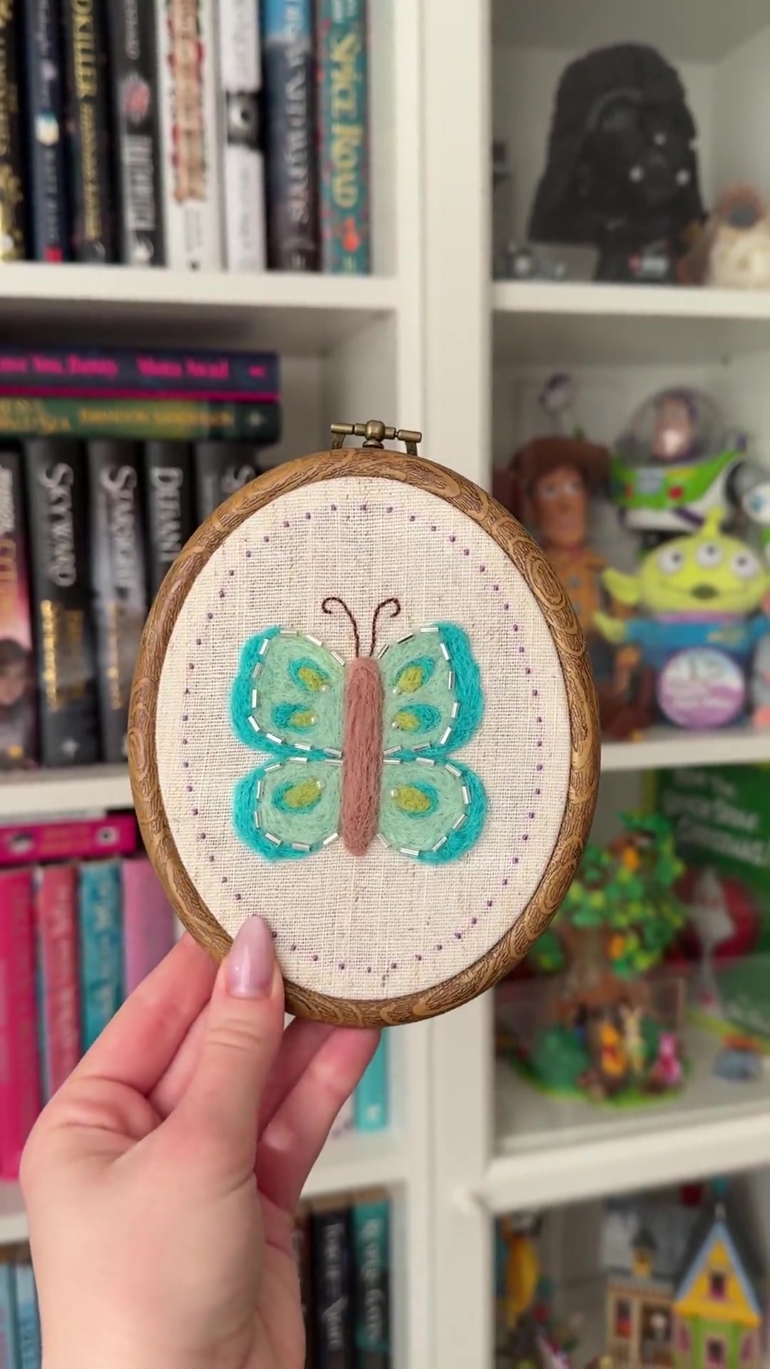 Ez a kis pillangó gyapjúból készült, tűnemezeléssel, és egy kis hímzéssel, illetve gyöngyökkel lett kiegészítve, hogy igazán különleges legyen.