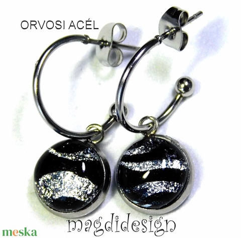 EXKLUZÍV Fekete ezüst zebra üvegékszer lógós fülbevaló - Anyák napjára, ballgásra
