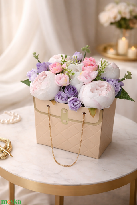 Elegáns virágtáska élethű peóniával és rózsával