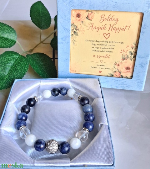 Anyák napi ajándék: ásvány karkötő díszdobozban, kísérőkártyával- szodalit, jáde, hegyikristály