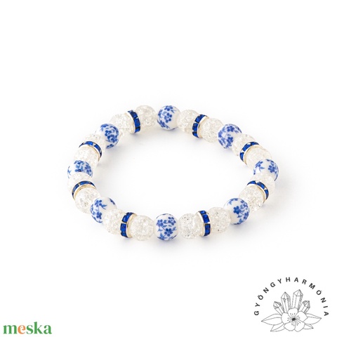 A sötétkék árnyalat eleganciát és mélységet ad a karkötőnek, míg a porcelán gyöngy finom mintázata és a strasszos köztes visszafogott csillogása harmonikusan egészíti ki a hegyikristály tiszta megjelenését.