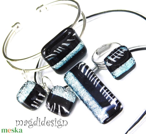 EXKLUZÍV Fekete ezüst zebra üvegékszer szett nyaklánc, karkötő, gyűrű fülbevaló - Anyák napjára, ballgásra