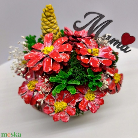 Kézzel festett tobozvirág-dísz kerámia tálban – piros – „Anya" / „Mama" felirattal, anyáknapi ajándék