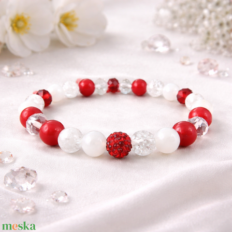 Piros-fehér ásvány karkötő fehér acháttal, jádéval és hegyikristállyal – 16,5 cm