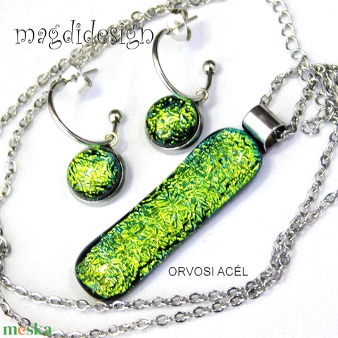Exkluzív szikrázó zöld dichroic üvegékszer szett nyaklánc lógós fülbevaló 1