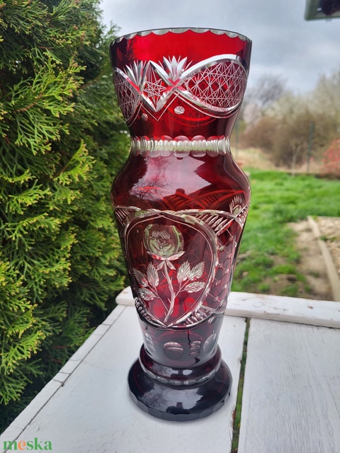 Vintage cseh Bohemia ólomkristály váza_rózsaszál díszítéssel