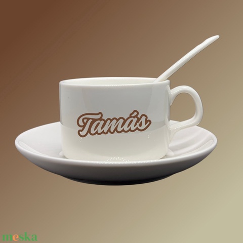 Kávés csésze egyedi névvel, tányérral és kanállal.