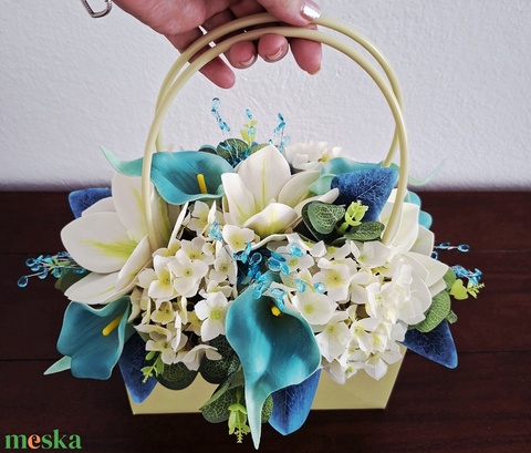- Anyag/Összetevő virágtáska, kék levelek, eukaliptusz, magnólia, kála, apró fehér virágok, akrilgyöngyök, gyöngyök