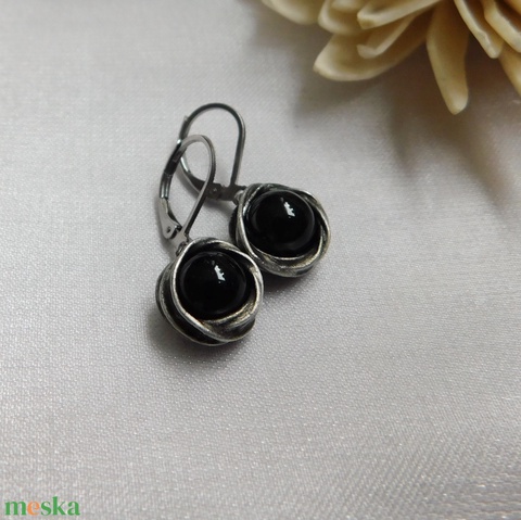 A fülbevaló tiffany technikával készült ólommentes, ezüsttartalmú ón, réz és obszidián felhasználásával. A díszítés szintén saját készítésű, nem tartalmaz gyári elemeket. A díszítés szintén saját készítésű, nem tartalmaz gyári elemeket.A fémrészt óezüstre patináztam és lelakkoztam, hogy sokáig szép maradjon.