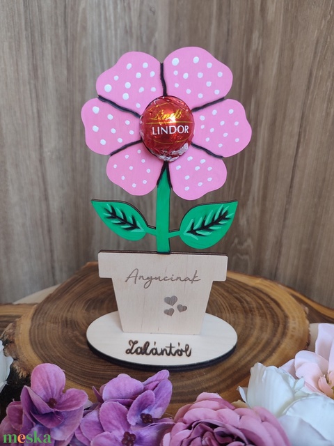 "Anyucinak" feliratú anyák napi virág dekoráció, csokival, kézzel festve