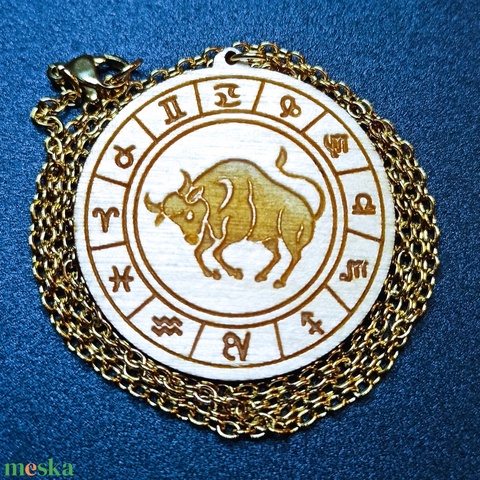 Egyedi készítésű Bika horoszkópos nyaklánc natúr fa medállal.