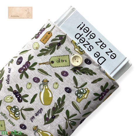 Te is szeretnéd biztonságban magaddal vinni a könyvedet vagy tabletedet? Akkor neked készült ez a pamut textil könyvtok. Mediterrán olajbogyó és olíva olaj mintával mintával, pamut textil béléssel, ami közé még egy vastagabb bélés is került, hogy biztosan megvédje a könyveidet. Talpmérete is van, hogy ne tegye tönkre a könyv sarkait. Tetejét különleges, egyedi hímzéssel díszítettem.
