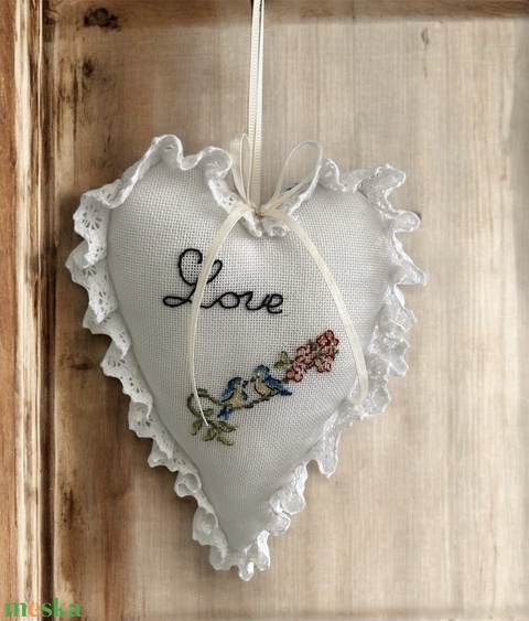 Szív alakú, keresztszemes hímzéssel díszített anyák napi ajándék