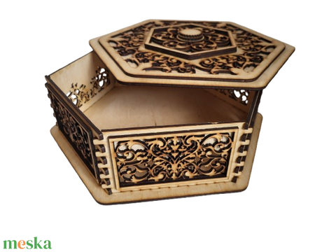 Ez a precízen lézervágott hatszögletű doboz tökéletes választás apró tárgyak, ékszerek vagy ajándékok tárolására. A gondosan megtervezett illesztések biztosítják a stabil szerkezetet, míg az egyedi kialakítás elegáns megjelenést kölcsönöz.