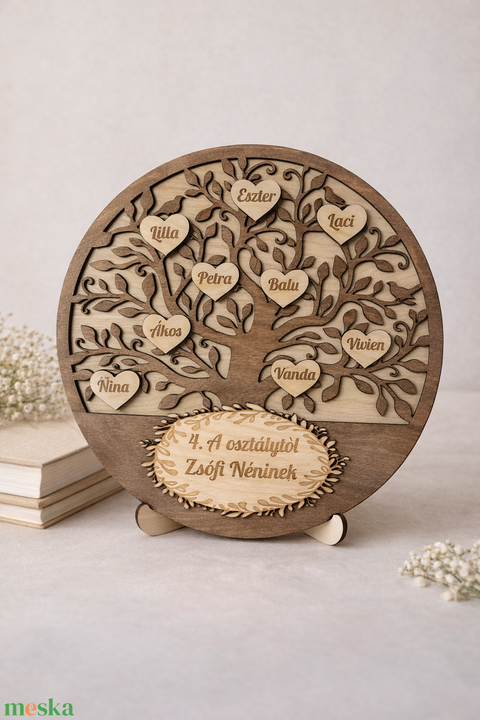 A fa életérzete, a gravírozott nevek és az egyedi felirat együtt egy igazán megható, személyes ajándékot alkotnak, amely mögött ott van az egész közösség szeretete.