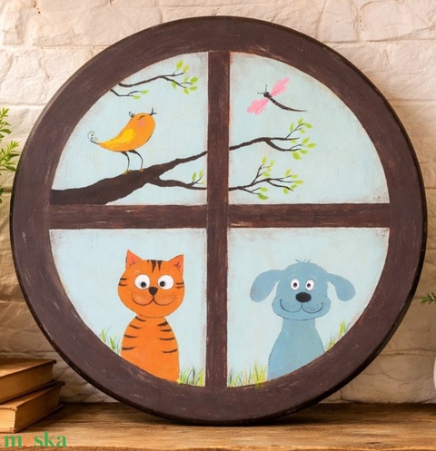 Kukucs /fali dekoráció, cica, kutya, akril festmény gyerekszobába