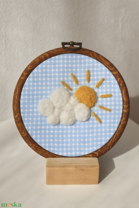 Ez a kis felhős-napocskás kép kézzel készült, merinói gyapjúból, tűnemezeléssel, és egy kék kockás vászon anyagon kapott helyet, amit fa hatású keretbe foglaltam. Igazi gyerekszobai darab, vidám és időtálló.