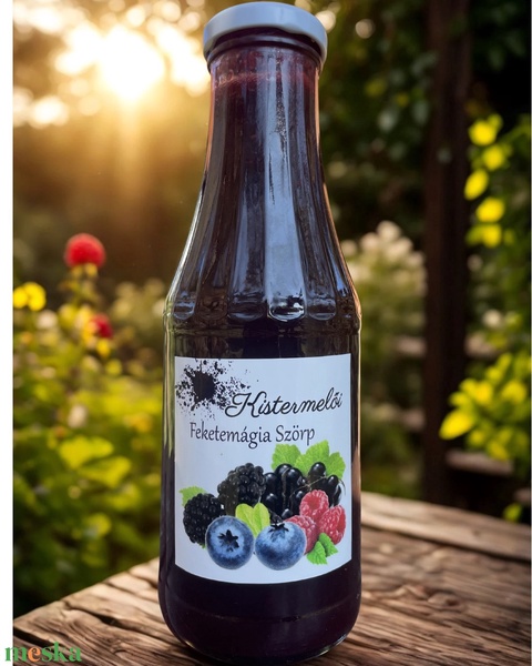 Magas gyümölcstartalmú, rostos, kézzel készített, saját termesztésű málnából valódi cukorral készült feketemágia szörp.