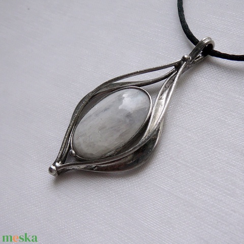 A medál Tiffany technikával készült szivárvány holdkő és ólommentes, ezüsttartalmú ón felhasználásával. A díszítés szintén saját készítésű, nem tartalmaz gyári elemeket. A fémrészt óezüstre patináztam és lelakkoztam, hogy sokáig szép maradjon.