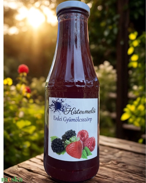 Magas gyümölcstartalmú, rostos, kézzel készített, saját termesztésű gyümölcsökből valódi cukorral készült szörp.