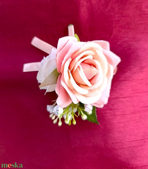 vőlegény/ fiú tanú kitűző, rózsaszín- fehér virágokkal