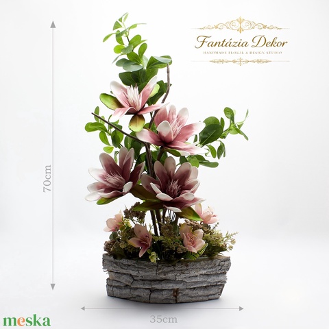Magnólia virágkompozíció rusztikus kaspóban – elegáns, kézzel készült lakásdekor
